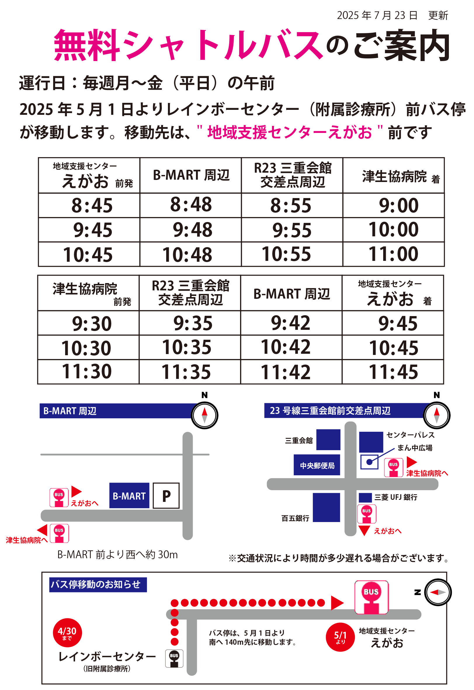 *病院独自の無料バスのため、B-MART橋南店周辺・三重会館周辺はバス停の設置ができません。出発時間までに所定の場所でお待ちください。下記の案内図をご確認いただき、ご不明なことがあれば電話にてお問合せください。